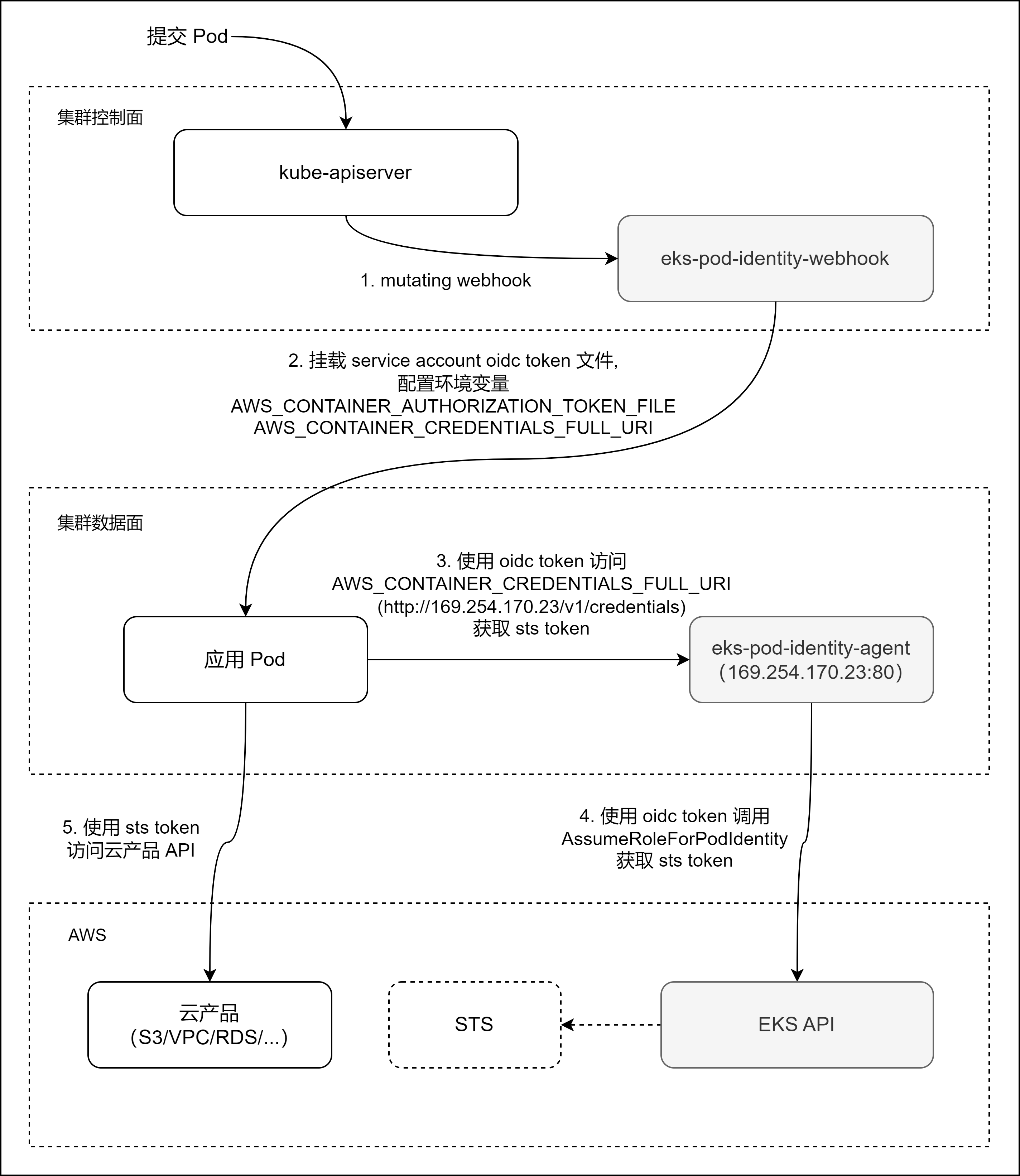 }- Pod 容器内的应用使用的 AWS SDK 将使用通过环境变量 AWS_CONTAINER_AUTHORIZATION_TOKEN_FILE 获取的 service account oidc token 访问环境变量 AWS_CONTAINER_CREDENTIALS_FULL_URI 指向的地址 (http://169.254.170.23/v1/credentials)获取 AWS sts token。
